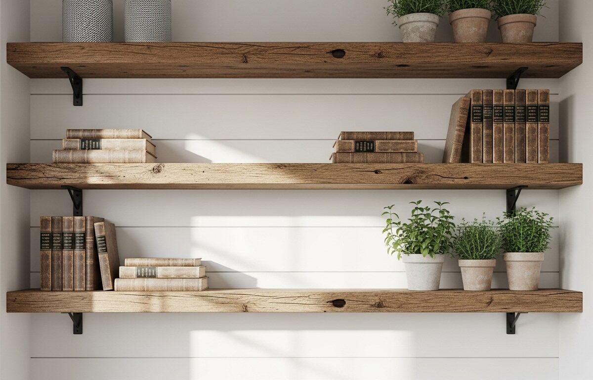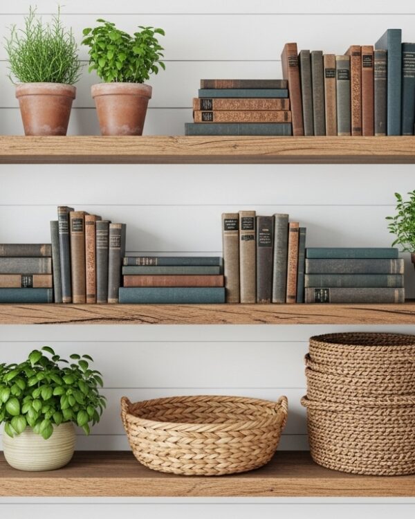 Start by assessing your space – measure those shelves and think about the room’s lighting, because natural light can make plants thrive and colors pop in that farmhouse way, but if it’s dim, opt for candles or lamps to create warmth. Layer items with varying heights, like stacking books under vases, to add depth without overwhelming the eye; I always step back and squint to check the balance, you know, to avoid that cluttered feel. And don’t forget to incorporate personal touches, maybe heirlooms or thrift finds, since that’s what makes the aesthetic feel authentic and not just copied from a pin – experiment a bit, and if something doesn’t click, swap it out until it feels right.