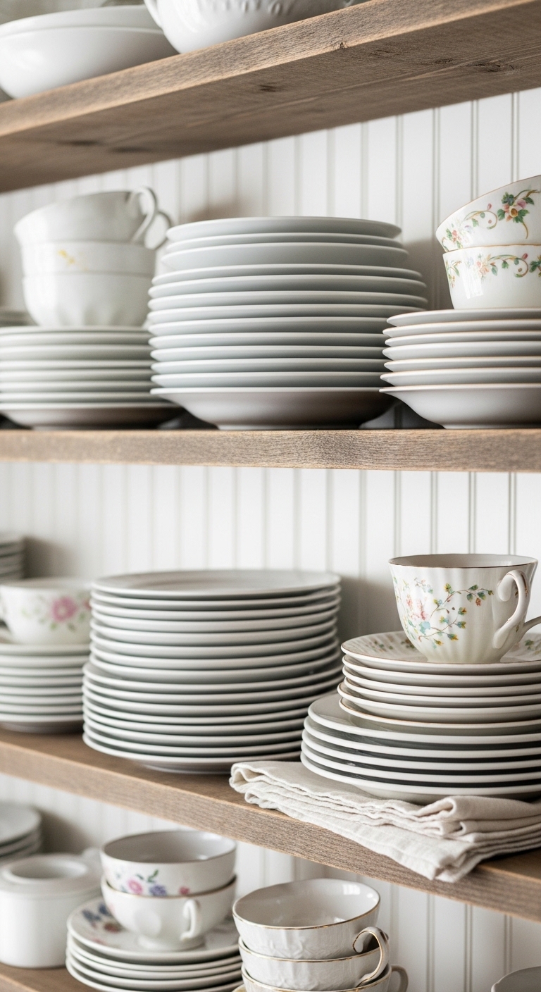 Layering antique dishware on open shelves gives that collected-over-time feel that’s fresh for farmhouse decor. I once inherited some mismatched plates from my aunt and arranged them like this – it added so much character to my dining area. You could hunt for pieces at thrift stores to make it uniquely yours, blending patterns for a charming, eclectic look.