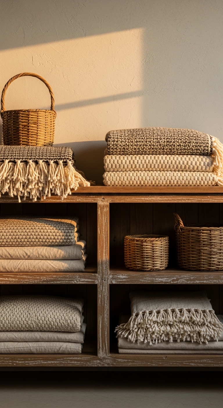 Styling shelves with layered textiles like blankets and baskets brings in that soft, tactile farmhouse element. I layered some in my mudroom, and it not only looks inviting but keeps things organized for chilly evenings. You might add a few dried flowers for a subtle pop of color, making it feel authentically cozy.