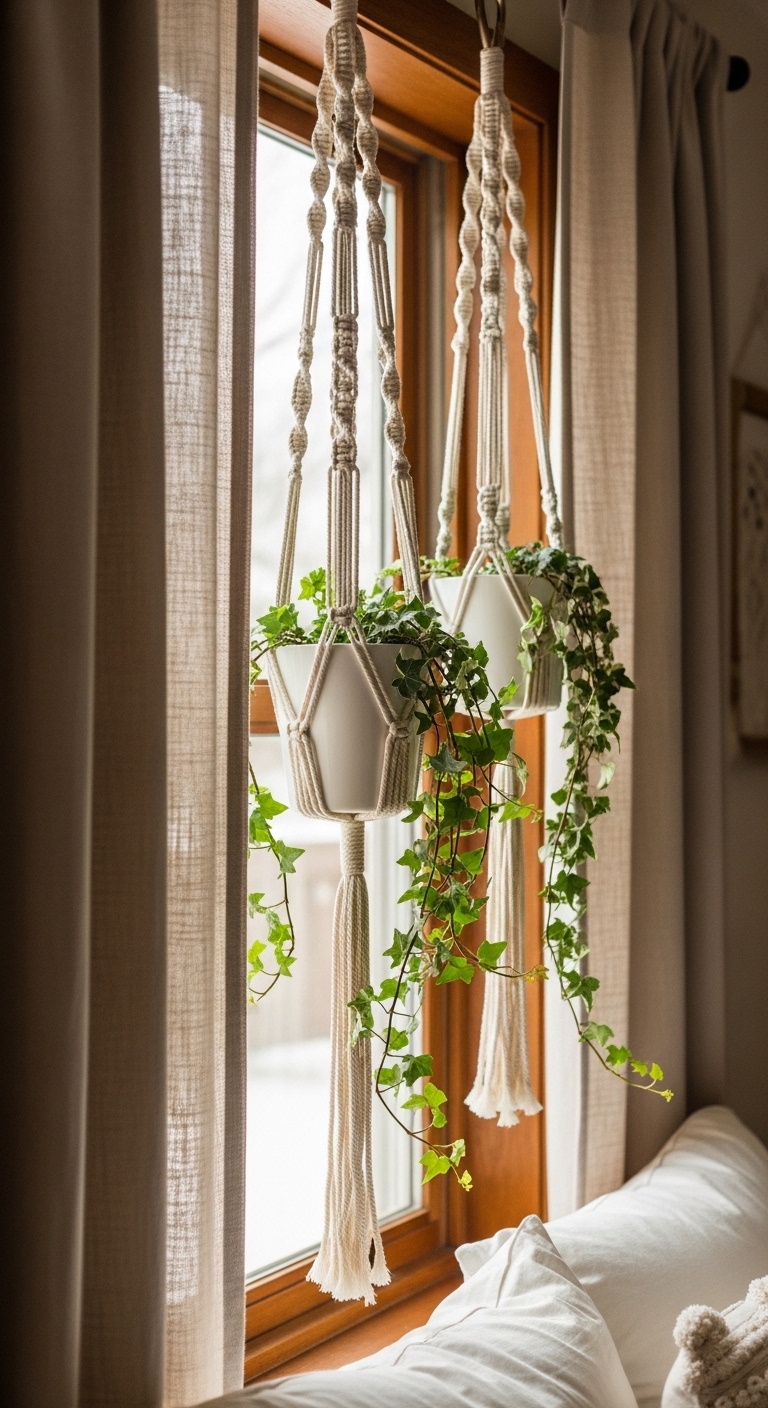 Macrame hangers dangling plants from the window frame add a boho twist to farmhouse decor. They’re easy to make and bring movement to the space. I crafted one last weekend, and it made my bedroom feel like a cozy retreat – though I tangled the knots a bit at first.