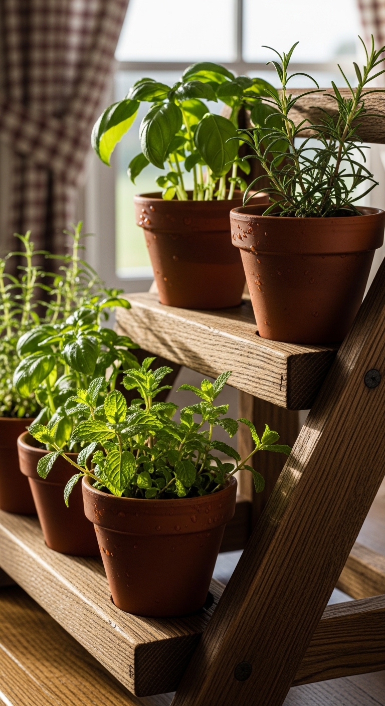 Plants lined up on the kitchen window ledge create a mini garden indoors. The natural vibe is so refreshing. Water them regularly to keep the look thriving.