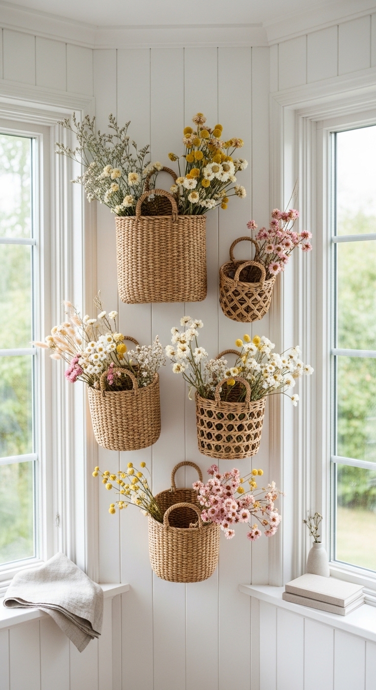 Hanging woven baskets with dried blooms from the window frame adds storage and style. It’s functional for small items while enhancing the aesthetic. I use mine for mail, and it keeps things tidy yet charming.