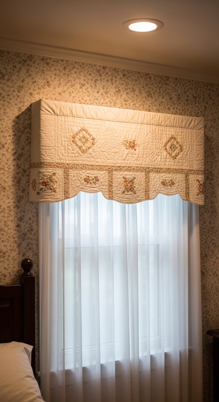 A quilted valance tops off the window with heirloom charm. It softens the top edge and adds pattern without blocking light. My grandma’s old quilts inspired this in my guest room – so sentimental.