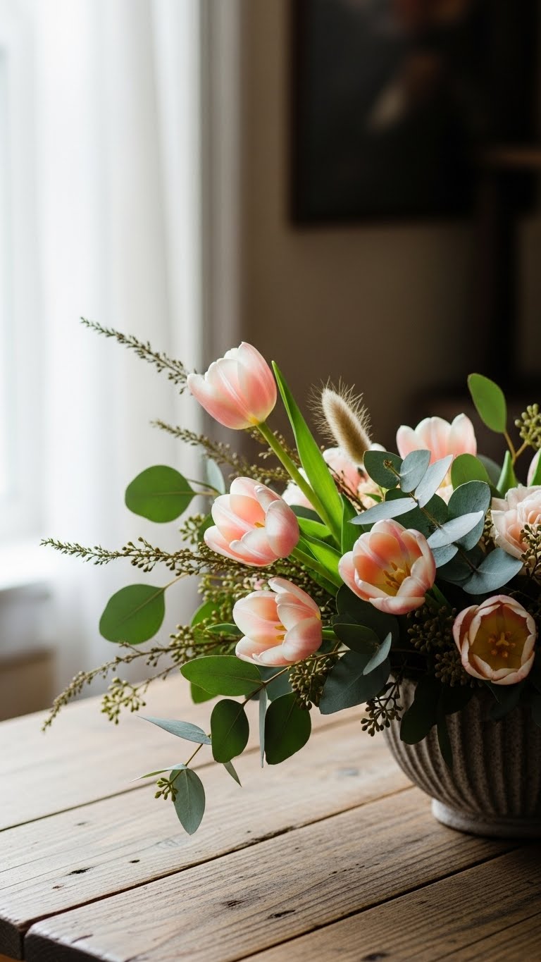 Grab local flowers from your market. Start with tulips and add eucalyptus for greenery. Mix in dried elements to save money. Use a simple glass jar as your base. This cuts waste and costs. For DIY fun, forage backyard greens. Arrange them low to keep views clear. Add a few daffodils for pop. Your table looks fresh and green. Try this for under $20. It brings nature indoors without the fuss.