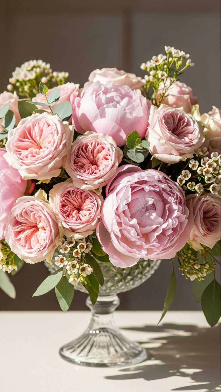 Go for all-blush flowers like peonies. Pick a few roses to mix in. Vary the shapes for interest. Use a plain vase you already own. This keeps things elegant and easy. Shop for sales on seasonal picks. Arrange them in a tight bunch. Add baby’s breath to fill gaps without spending much. Set it low on your table. It creates a soft focus. Build this at home for quick results. Everyone notices the charm.