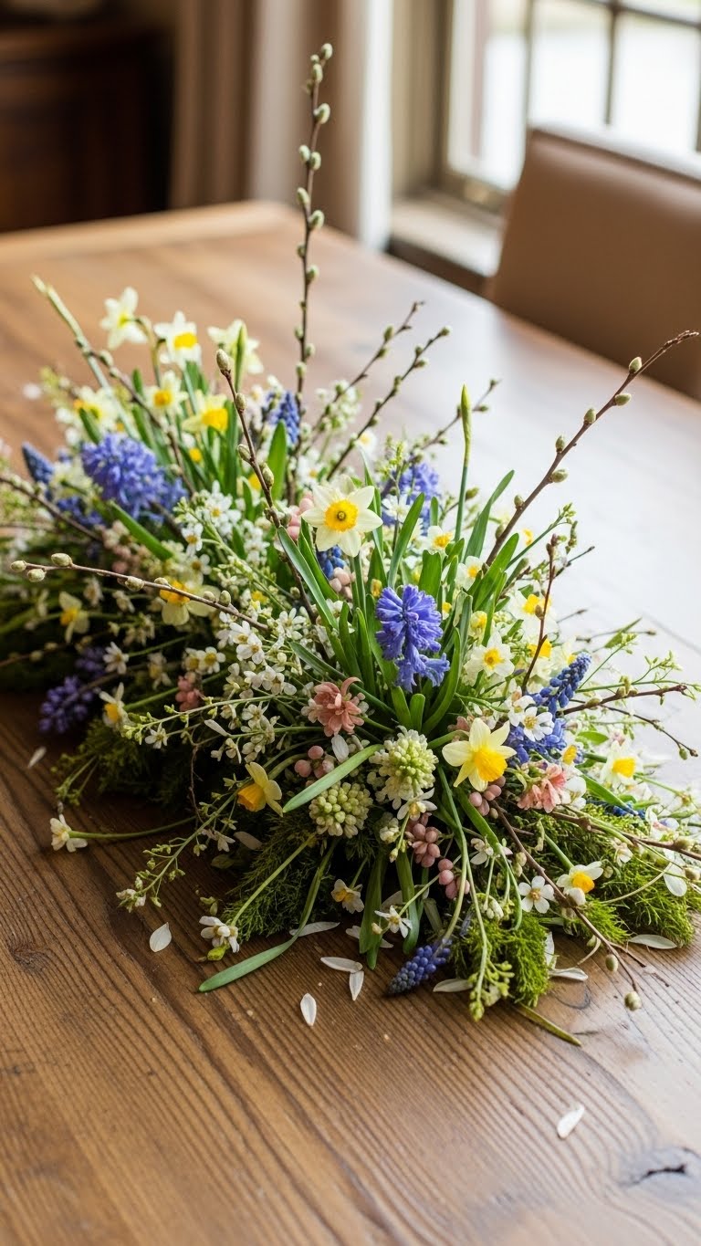 Spread grasses and petals out low. Use daffodils as your stars. This avoids blocking sightlines. Gather items from your garden. Layer them for a natural spread. Add hyacinths for scent. Keep the setup flat on the table. It feels like a mini meadow. Do this for pennies if you forage. Place it right in the center. Friends will feel immersed. Whip it up in no time.