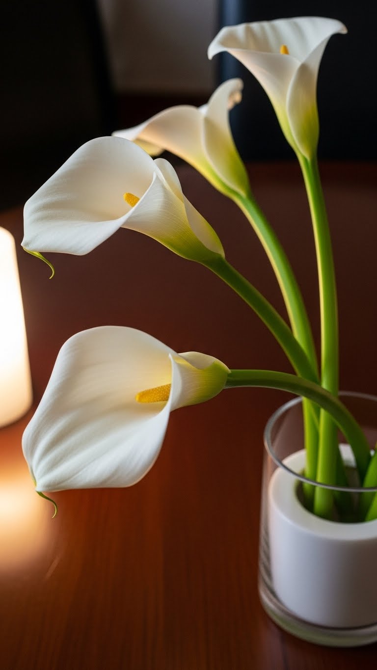 Show off calla lily stems. Trim them just right. Use a basic holder to prop them up. This adds a modern twist. Find lilies at local shops. Arrange them standing tall but simple. Tie with twine for a clean look. It costs less than fancy options. Set it as your table focal point. Guests see the details. Make this in your kitchen easily.