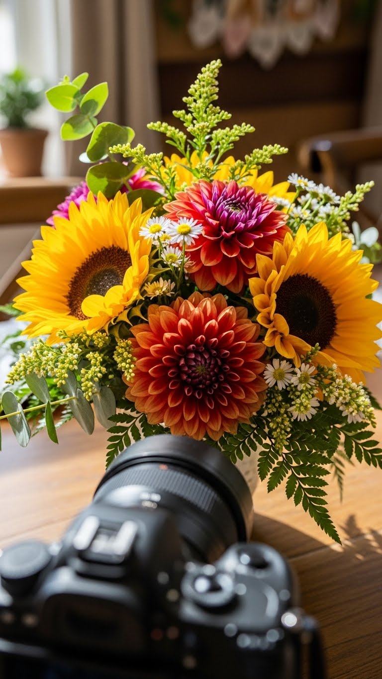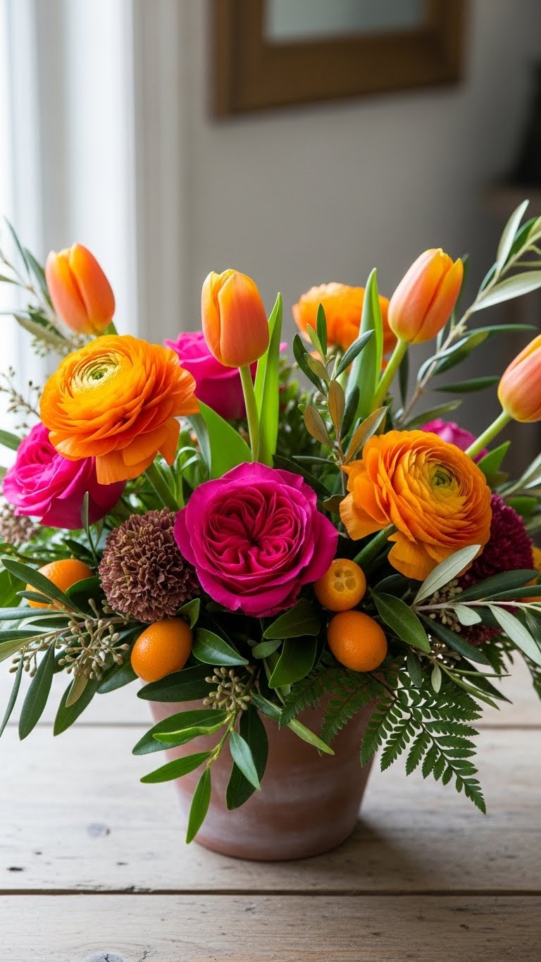 Go bold with oranges and fuchsias. Balance with greens. Use a simple pot from home. This pops on your table. Buy seasonal flowers cheap. Mix them in a loose bunch. Add a few extras for volume. It looks rich without the price. Center it for impact. Try this for a fun update.