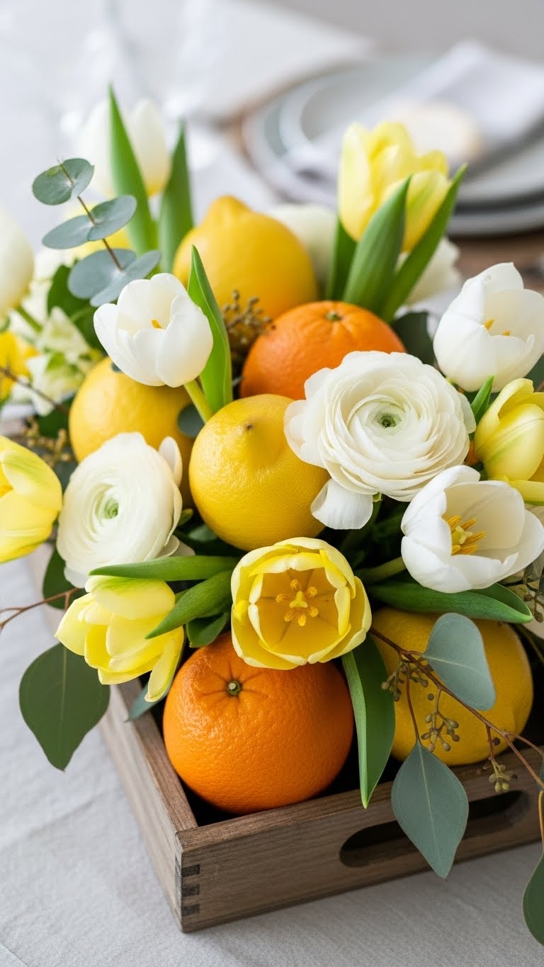 Add lemons and oranges. Pair with eucalyptus. Use a tray as base. This adds fresh vibes. Get fruit from the kitchen. Tuck in some blooms. It smells great too. Set up for under $10. Center it simply.