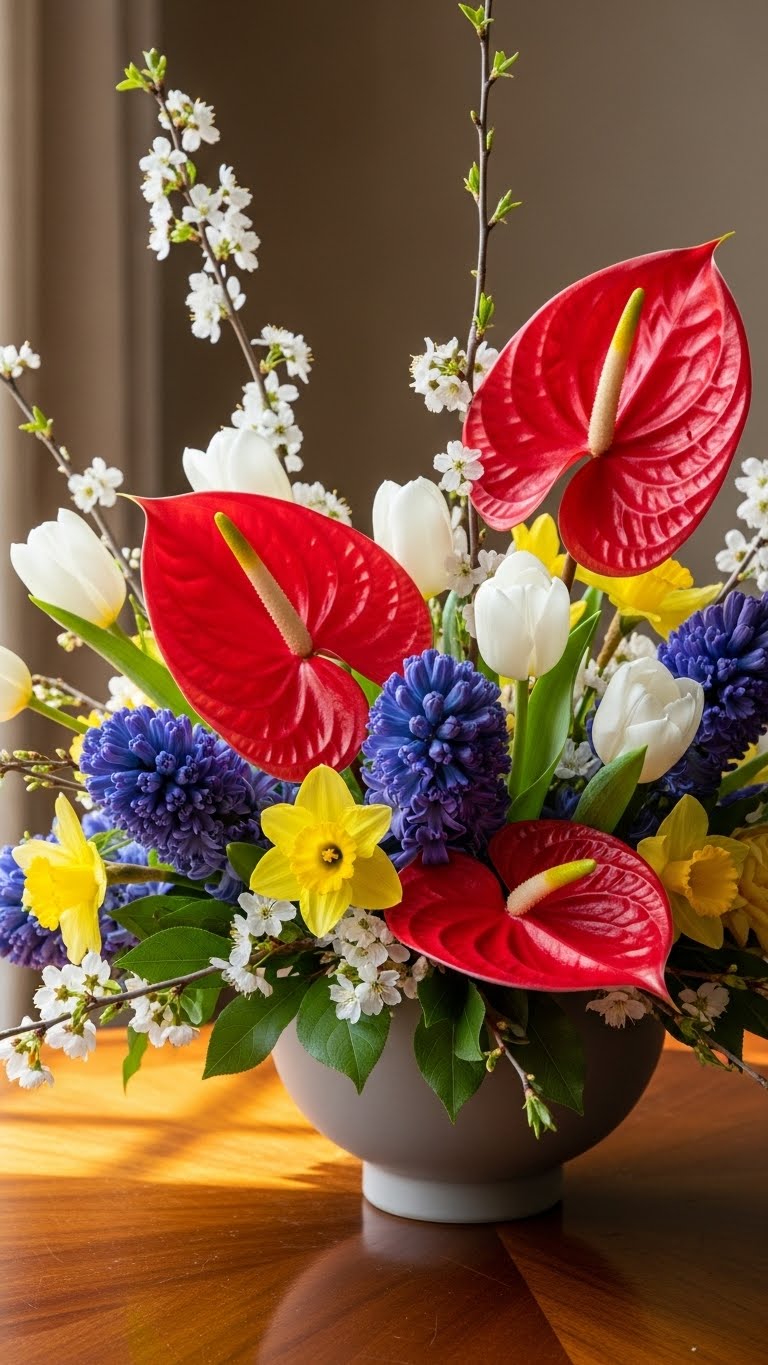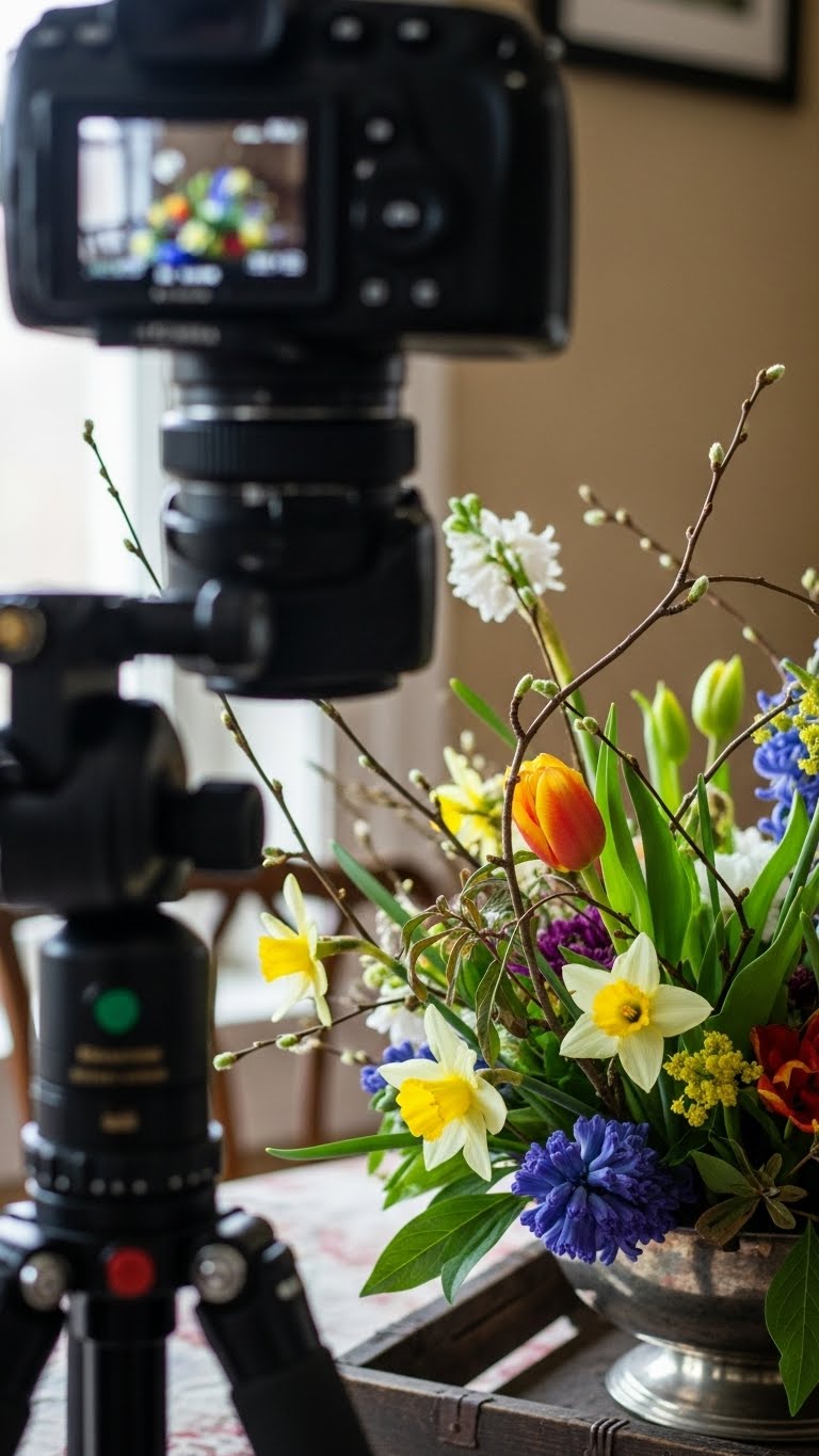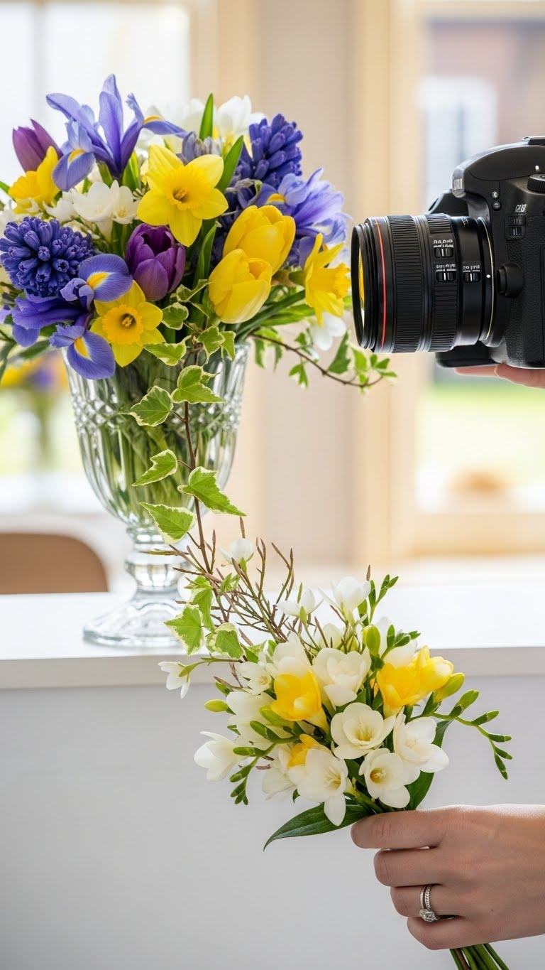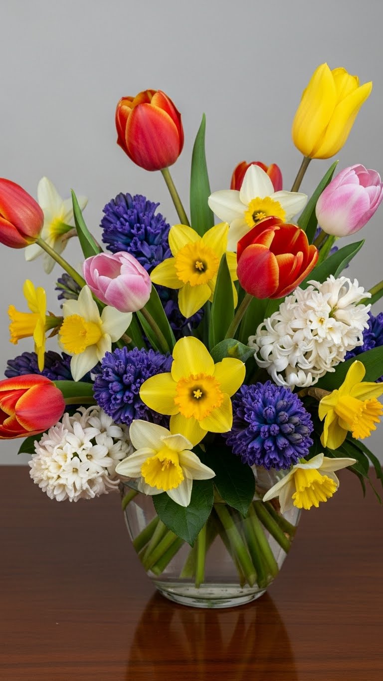 Focus on tulips and daffodils. Add hyacinths for scent. Use a recycled vase. This celebrates spring. Find them fresh and affordable. Bunch them together. It perks up your space. Do this weekly.