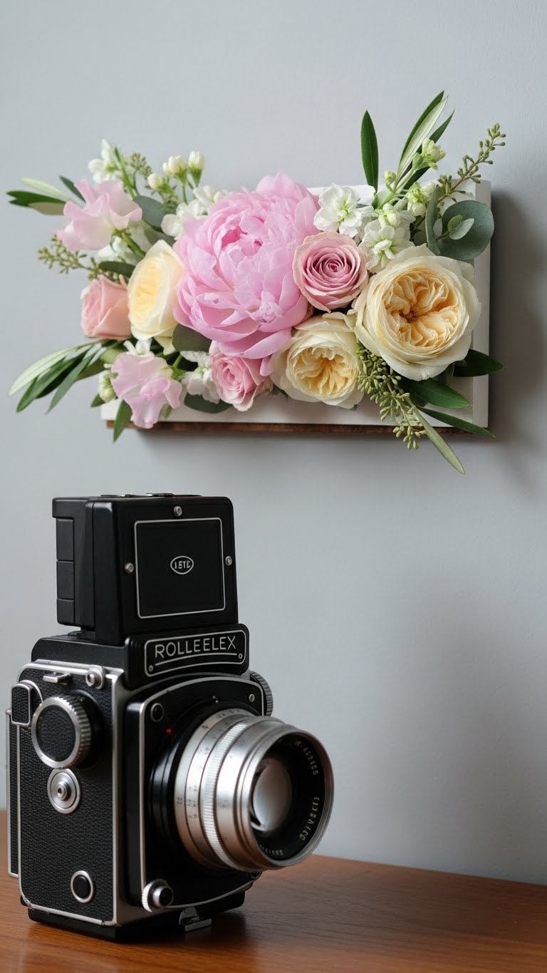 Use peonies and roses in pastels. Make a mini wall. This brings big impact. Source from sales. Attach to a frame. Keep it small for ease. Place near your table.