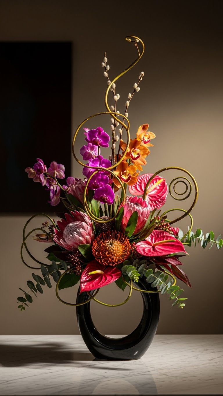 Pick exotic stems. Arrange in shapes. Use what you have. This stands out. Buy a few specials. Build layer by layer.