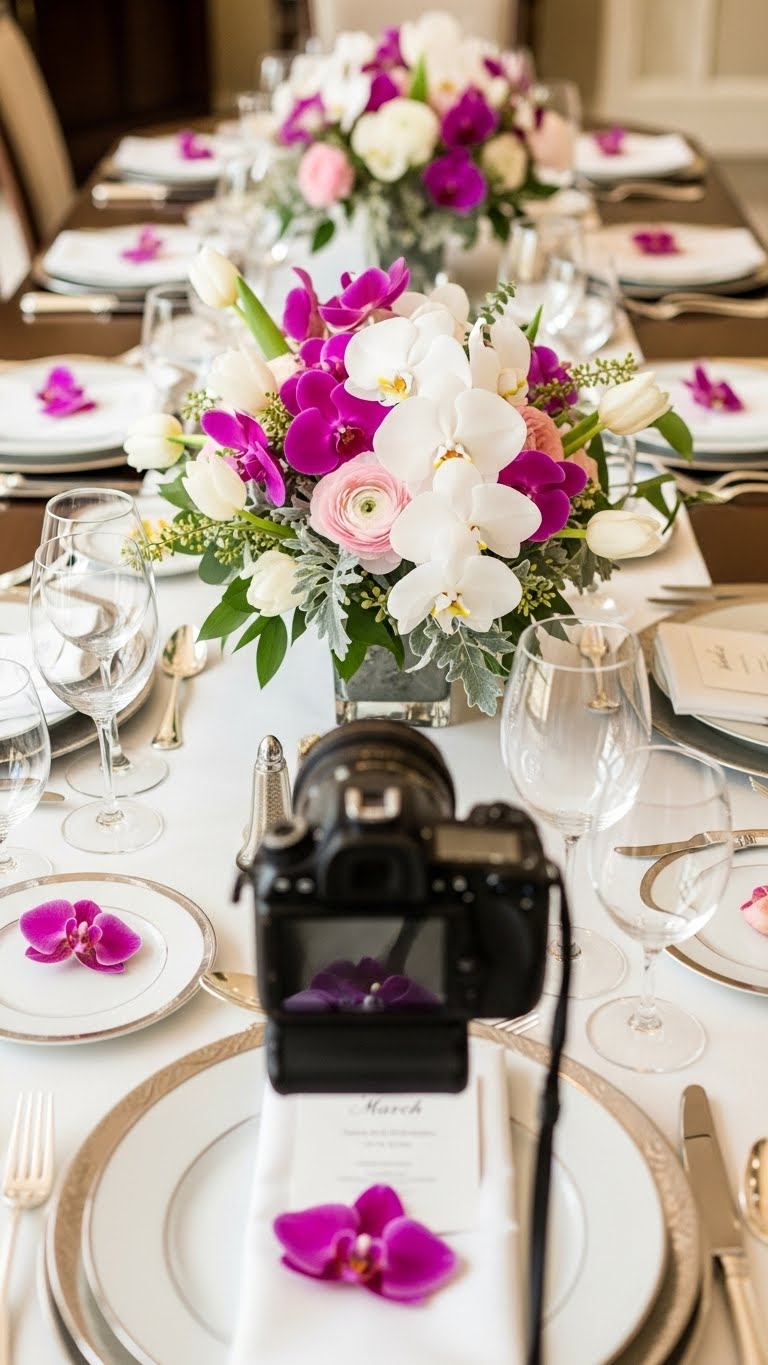 Put orchids at seats. Use small holders. This feels luxe. Buy on sale.