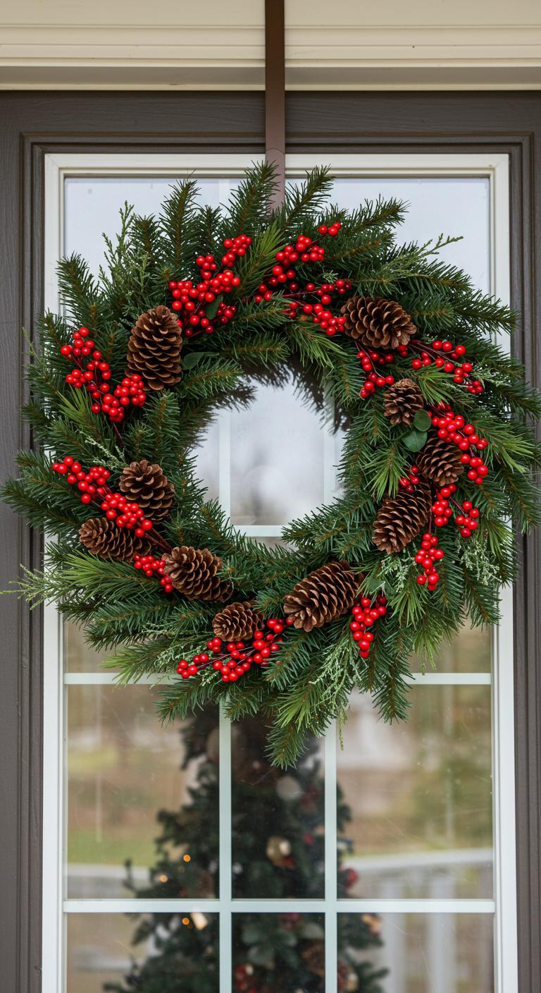 When you hang a classic evergreen wreath adorned with bright red berries and rustic pinecones, your porch instantly feels welcoming and festive.
