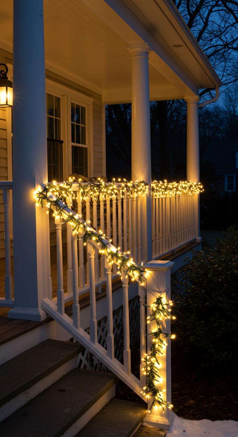 If you wrap your porch railings in delicate fairy lights, the whole entryway will glow with a cozy, magical warmth that invites guests in; twinkling strands accent the architecture and add depth without overwhelming the space.