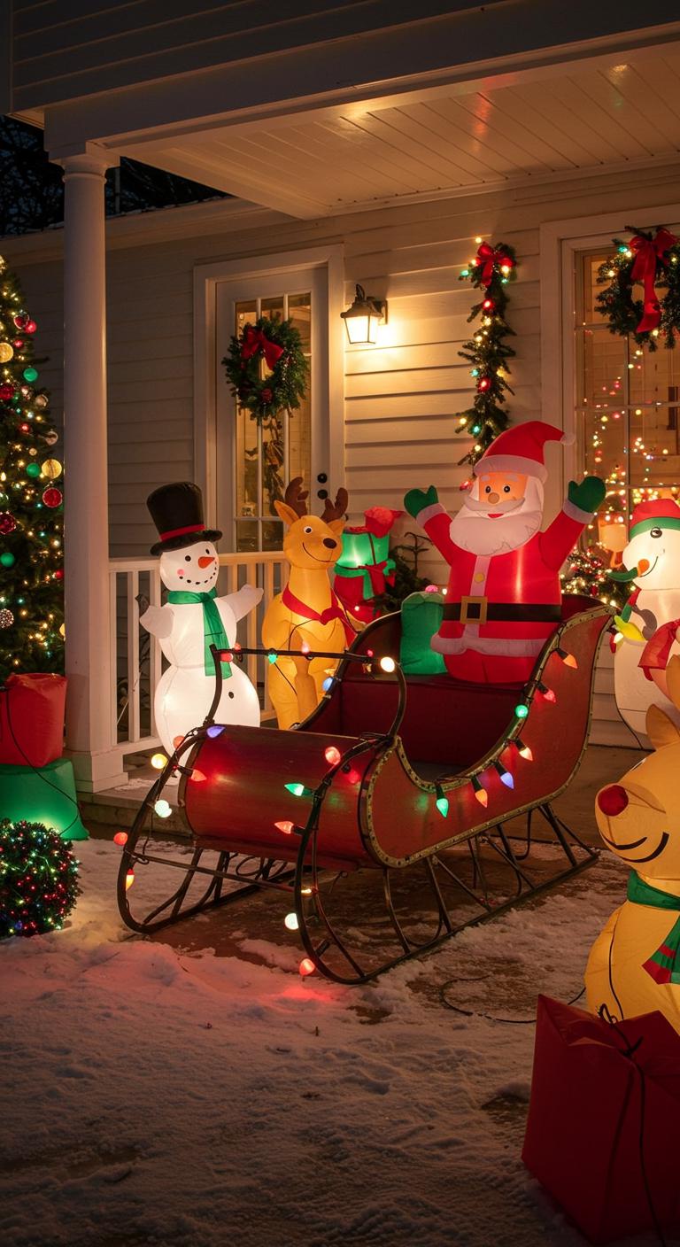 If you love the nostalgic charm of a vintage sleigh, add a playful counterpoint with inflatable holiday characters to keep the mood light and welcoming.