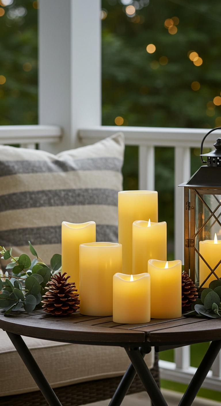 You’ll mix heights, scented or unscented options, and natural accents—pinecones, eucalyptus, a small lantern—to build a portable porch table display that feels inviting, safe, and effortlessly yours.