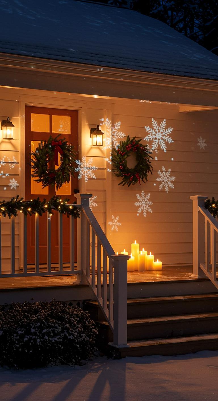 You can pair the cozy, flame-free glow of your candle cluster with snowflake projector lights to add movement and magic to your porch after dark.
