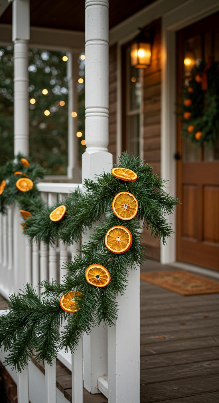 A simple pine garland threaded with dried orange slices brings a bright, rustic scent and timeless color to your porch—lay it along the railing, drape it over the doorframe, or weave it through banister spindles to create instant holiday warmth.