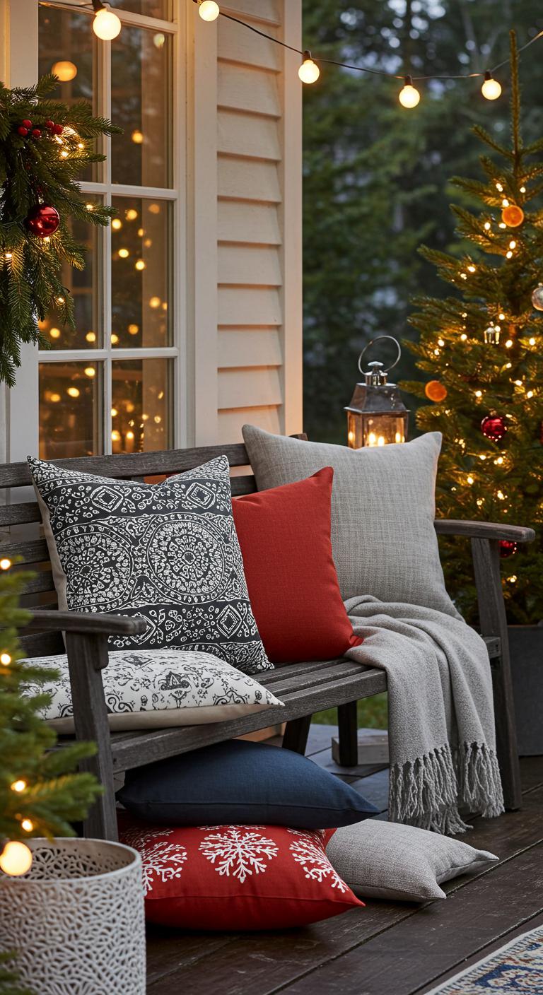 Choose weatherproof fabrics for outdoor comfort, mix bold festive patterns with solid neutrals, and drape throws over benches.