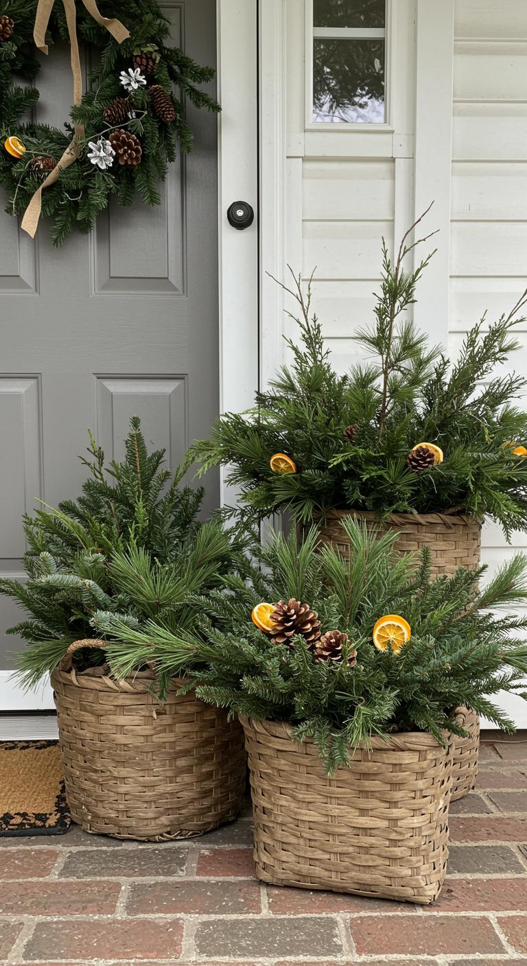 Place three woven baskets of varying heights beside your door and fill them with different evergreens—fir, cedar, and spruce—for an effortless, layered look that smells as good as it looks.