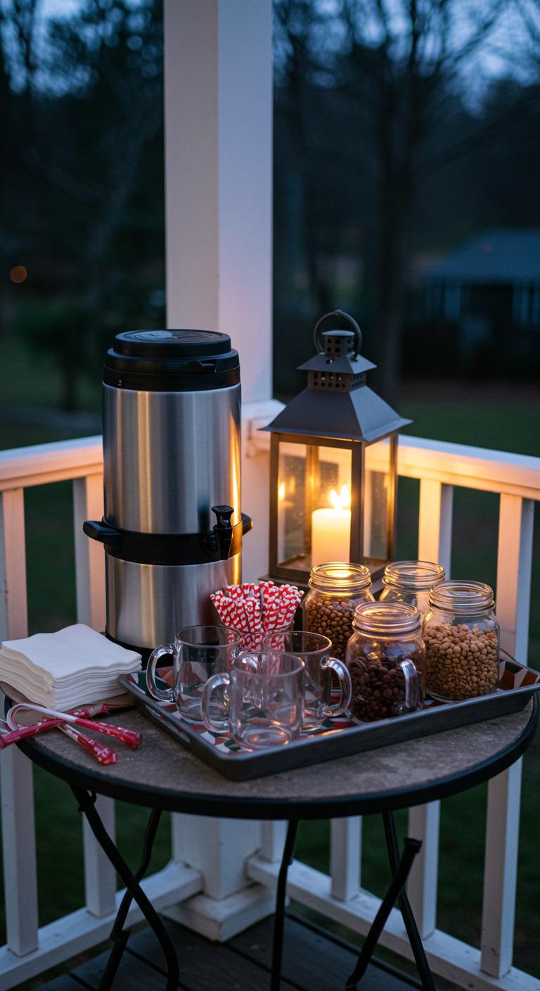 Set up a cozy mini hot cocoa station on your porch to welcome guests with warmth and charm; a small table, a thermal dispenser or crockpot filled with hot chocolate, and clear mugs lined on a tray make serving effortless.