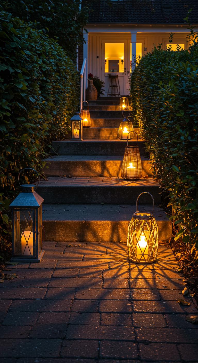 Choose varied lantern styles for personality—metal, wicker, glass—and place them evenly for safe, subtle step lighting.
