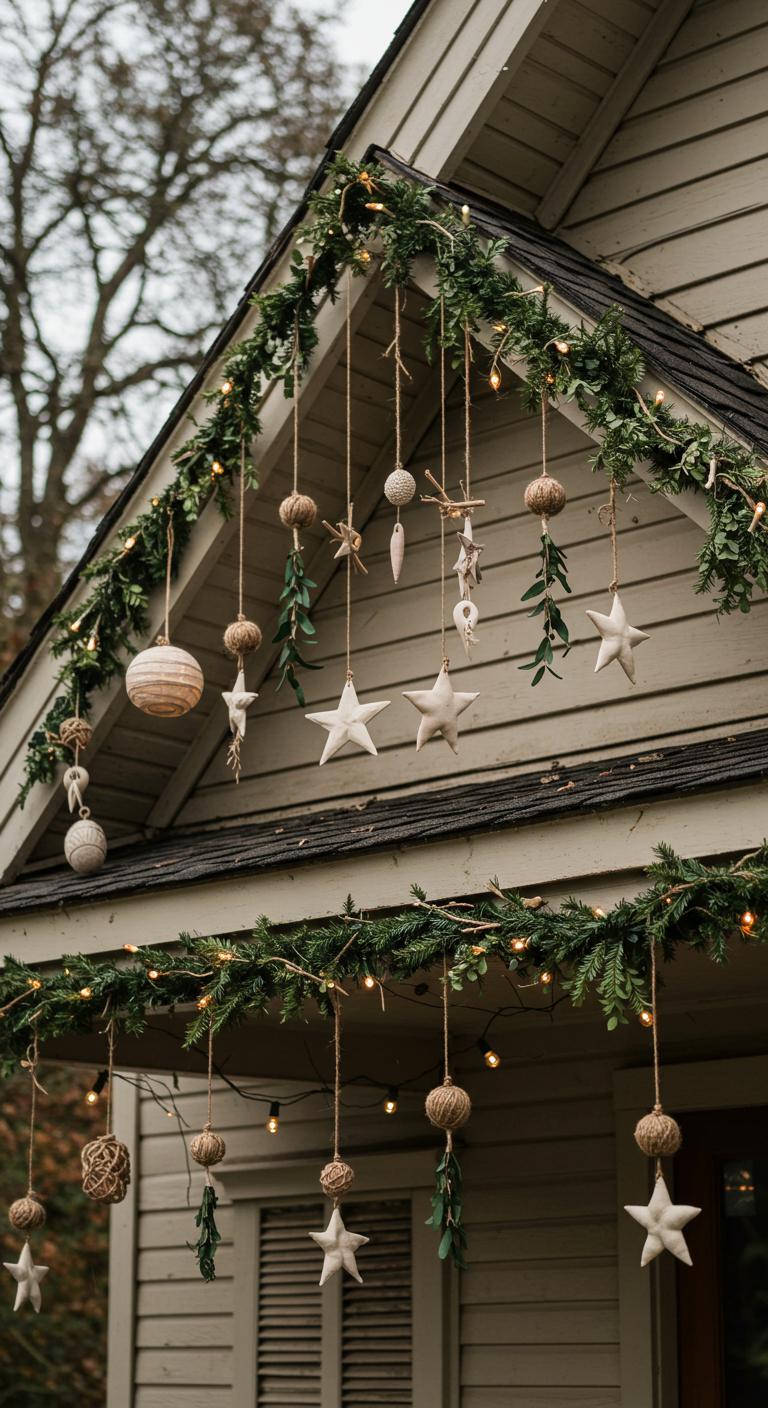When you weave stringed ornaments along the roofline, you create a playful, eye-catching silhouette that greets guests before they even reach the porch; lightweight baubles, wooden stars, and felt greenery hung on twine or clear fishing line catch the breeze and soften the home’s edges.