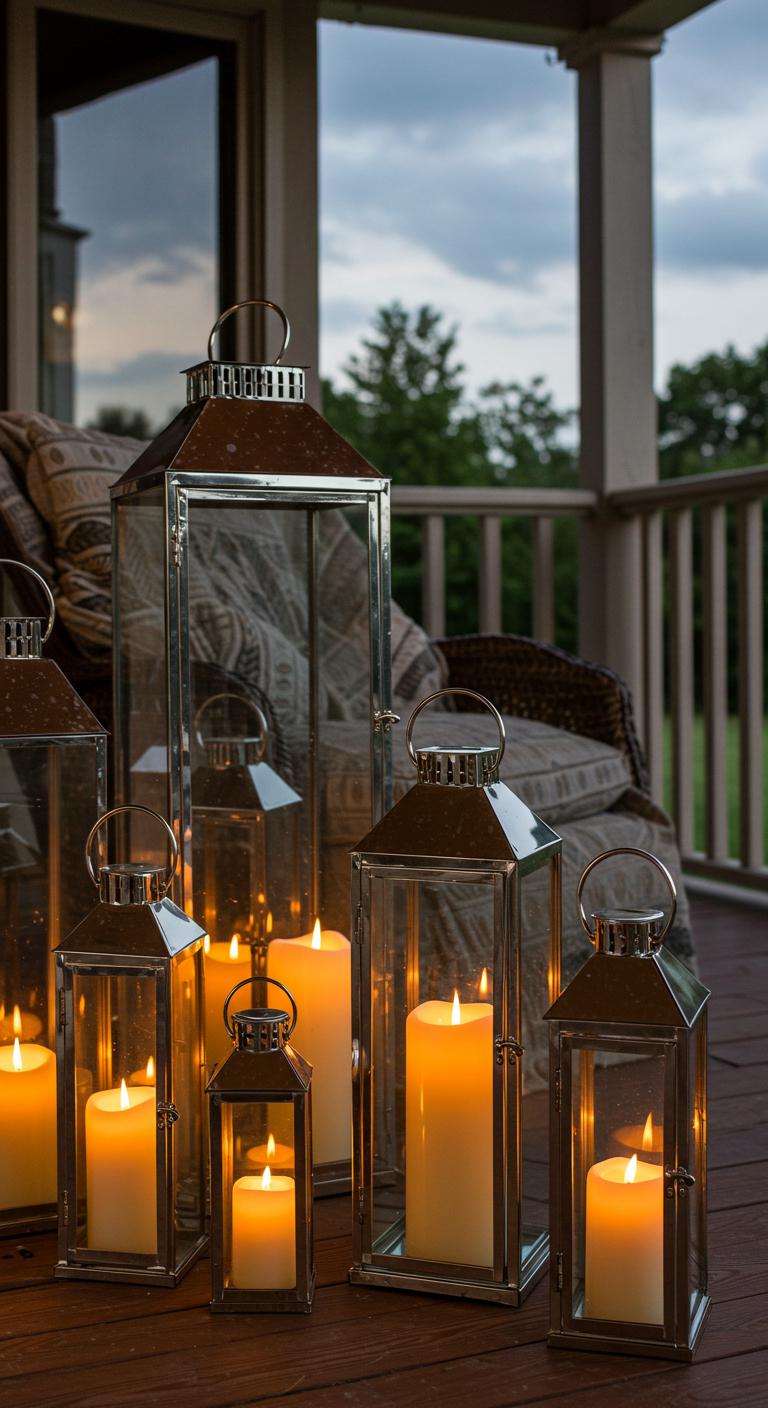 You can carry that same cozy, rustic vibe into your lighting by adding mirrored lanterns that multiply candlelight and make small porches feel brighter.