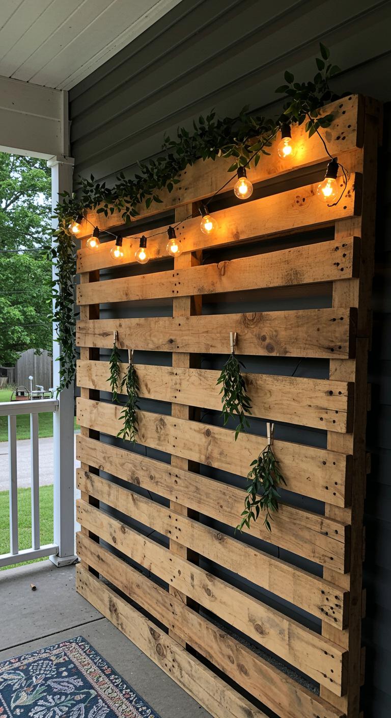 You’ll transform pallet art into a statement by sanding, staining, and mounting it against the wall, then weaving a warm string display of bulbs and tiny clips for greenery.