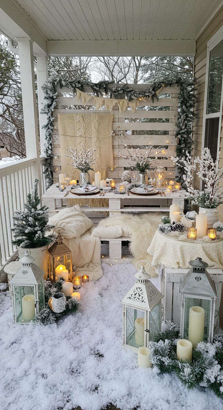 Moving from the cozy, rustic charm of a pallet backdrop, an elegant white and gold winter wonderland brings a brighter, more refined mood to your porch while keeping that same inviting feel.