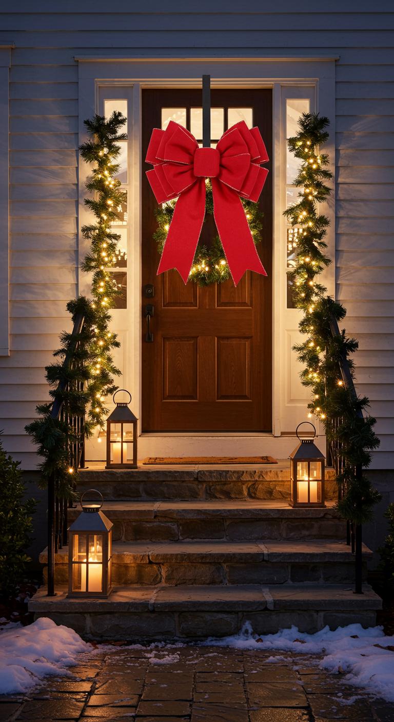 Carry the warm glow from your lantern-lit steps up to the door with an oversized red bow that makes a bold, festive statement. You’ll choose weatherproof oversized ribbon, secure it with a discreet hook, and shape full loops for drama. This door embellishment feels welcoming without fuss, letting you personalize size and texture so your porch reflects joyful independence and effortless holiday flair.
