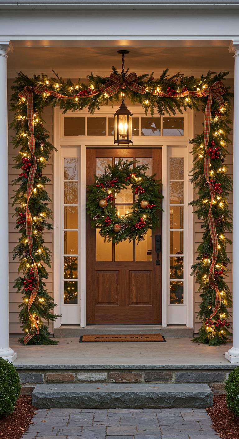 Drape a lush garland over your door and wrap it around columns to instantly frame the entry with seasonal cheer; choose greenery that suits your climate—fresh pine for scent, faux for low maintenance—and weave in lights, berries, or ribbon to match your porch’s color story.