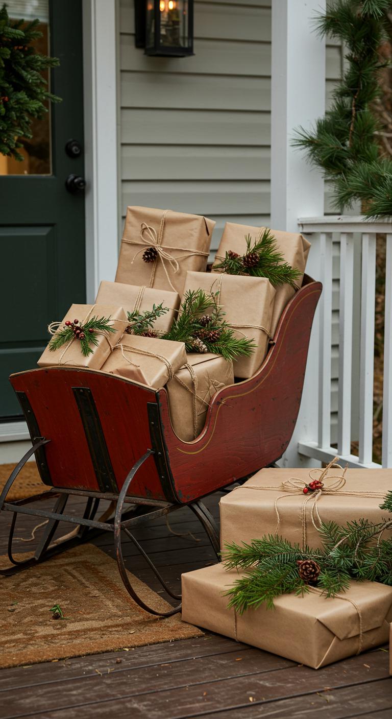 When you place a vintage sleigh on the porch and pile it with carefully wrapped gifts, it becomes an instant focal point that feels both nostalgic and welcoming.