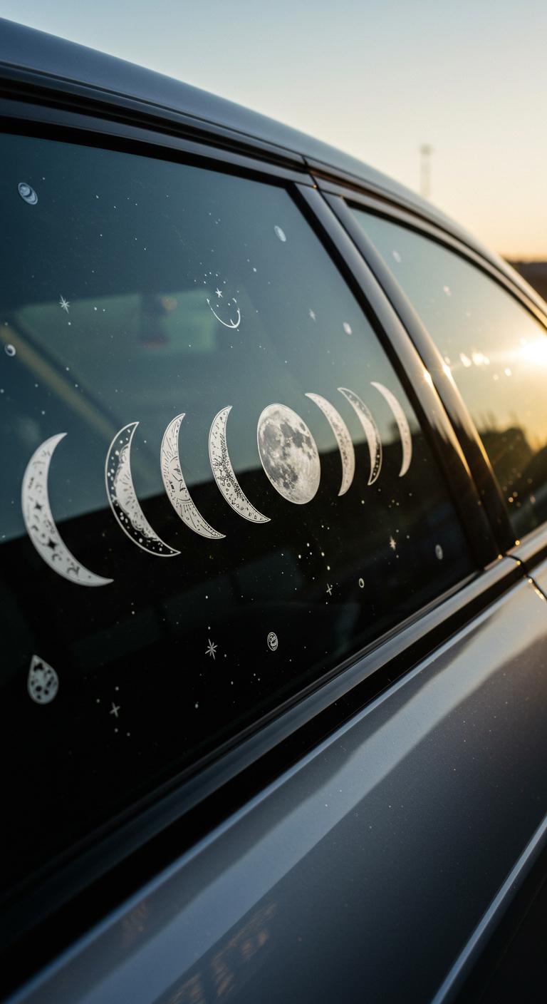 Decorate your windows with moon phase stickers for an easy and stylish touch. These stickers are often removable, making them perfect for renters or anyone who changes their decor often. You can find these stickers online or in local shops. They come in various styles, from minimalist black and white to colorful designs. Apply them to your side windows, rear window, or even the windshield. Let the magic of the moon inspire your driving experiences. Plus, if you want a personal touch, consider making your own stickers using printable sticker sheets!