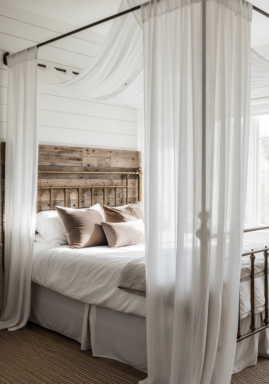 Transform your bedroom into a glam farmhouse retreat by DIYing a canopy with thrifted curtains and a wooden frame – it’s surprisingly cheap and looks so luxurious. I remember rigging one up in my guest room using branches from the yard and some clearance fabric; guests always rave about it. Keep the colors neutral for that elegant touch. You won’t believe how it elevates the whole space without spending much.