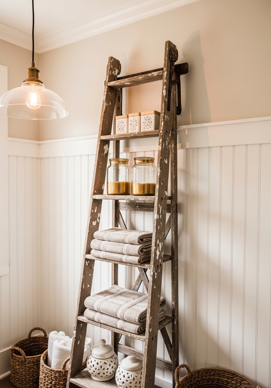 Turn an old ladder into shelving for bathroom storage with glam touches like metallic jars – super budget-friendly and trendy. I found a ladder at a yard sale and painted it; now it holds all my essentials stylishly. It adds height and interest to small spaces. Such a fun way to mix rustic with shine.
