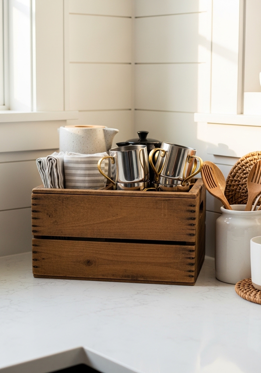 Create a charming coffee nook using a thrifted crate and gold mugs for that glam farmhouse perk-up spot. I set one up in my kitchen corner, and it’s my daily ritual haven – cost next to nothing. Add some fresh beans and a small sign for personality. You can even use it for tea if that’s your thing.