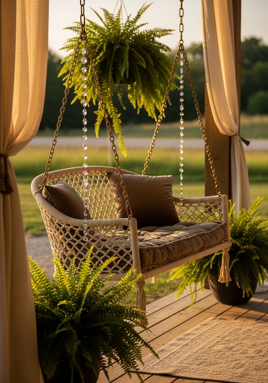 Hang a budget swing on your porch with glamorous cushions and beads for an outdoor glam farmhouse escape. I added one to my front porch last summer, and it’s my sunset spot – thrifted the cushions for pennies. Drape some lights for evening sparkle. Feels like a high-end retreat right at home.