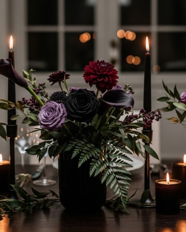 Lit candles in jars with flowers and greenery on wood – cozy and romantic. We used this vibe at my sister’s party; the flicker made everything feel intimate. Pro tip: battery tea lights if flames freak you out.