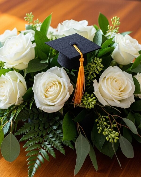 Grad hat brimming with flowers – iconic and bold. On a table, it’s the focal point. Stuffed one for photos; bloomed beautifully.