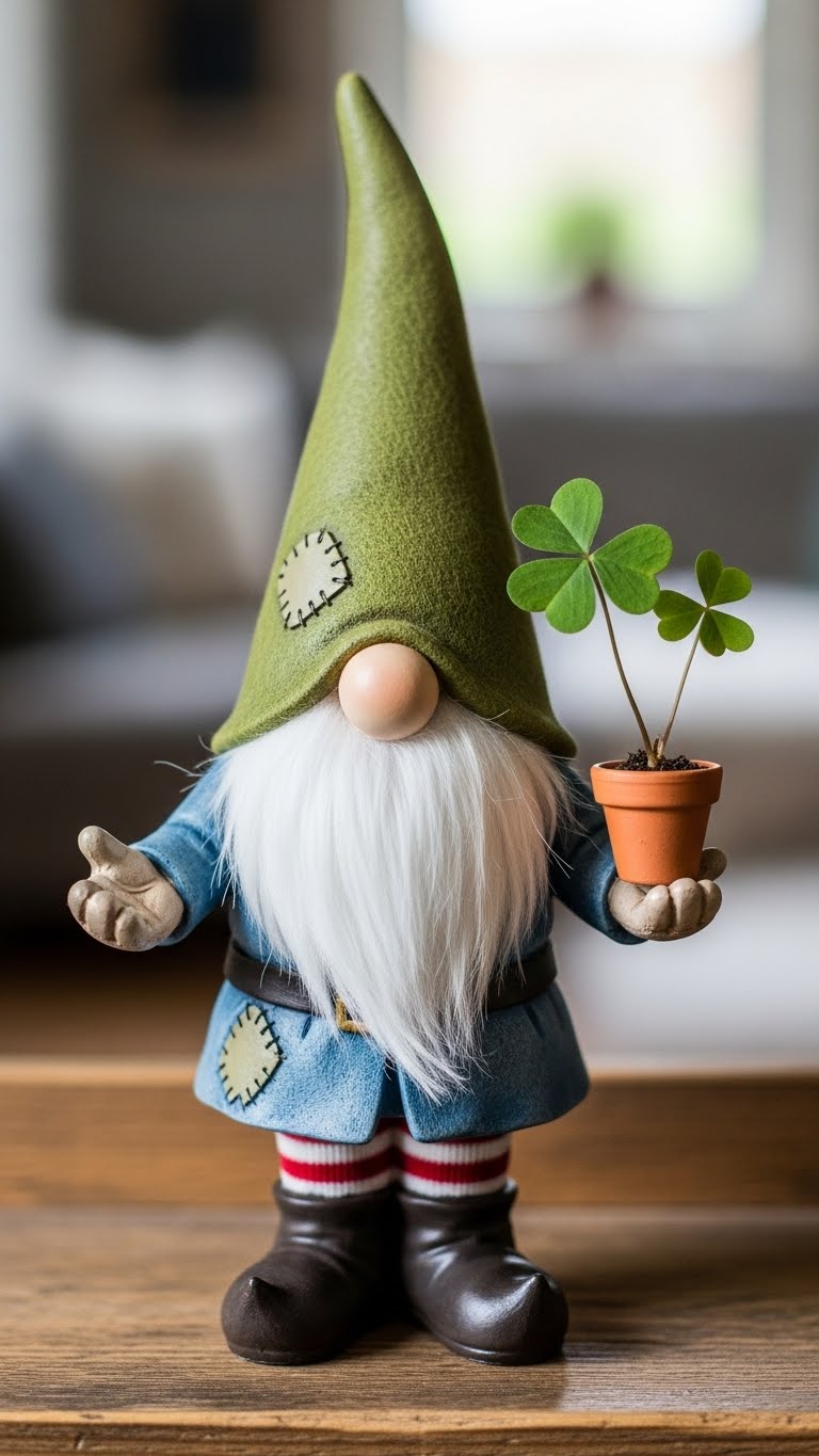 Find a gnome figure at a thrift shop. Plant shamrocks in its base. Set it on a shelf for personality. This adds whimsy to your decor. Spend less than $10 total. Use soil from your yard. Position in a sunny spot. Water the plants regularly. No advanced skills needed. Place near books or frames. Kids will enjoy this setup. Make it in about 20 minutes. Try different gnome styles. Keep it fun and affordable. Move it around rooms easily.