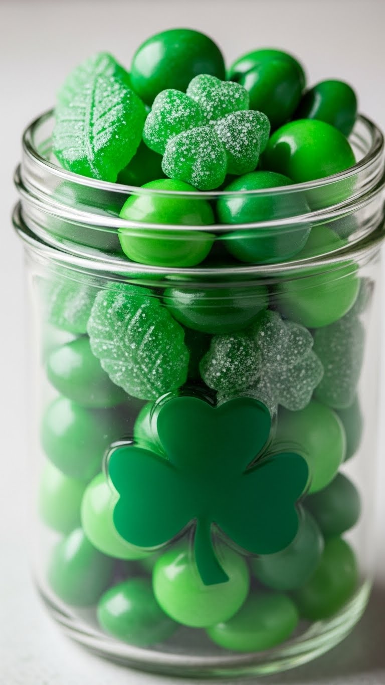 Fill mason jars with green candies. Add a clover tag from paper. Give them as gifts or treats. This makes edible favors easy. Use jars you already have. Candies cost a few bucks. Do this in 5 minutes. Place on tables for display. Tie with string for extra touch. No cooking involved. Share with friends at parties. Keep it under $5 per jar. Try different candy types. Enjoy the simple prep.