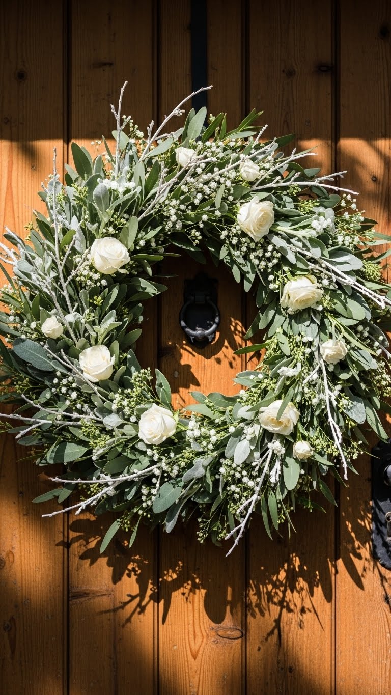 Twist green vines into a wreath base. Add white ribbons for contrast. Hang it on doors or mantels. This creates an inviting entry. Use free branches from outside. Ribbons cost pennies. Make it in 20 minutes. Position on front doors. No tools beyond your hands. Guests will feel welcomed. Try adding small flowers. Keep costs minimal. Display for the season.