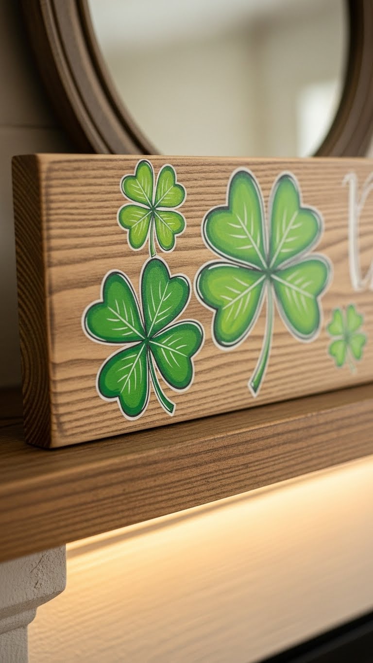 Paint a sign with the word “luck” in green. Use wood from old projects. Put it on your mantel. This adds a personal touch. Spend less than $4 on paint. Do it in 15 minutes. Lean it against the wall. No fancy brushes needed. Arrange with other decor. Guests might ask about it. Try different words. Keep the setup easy.