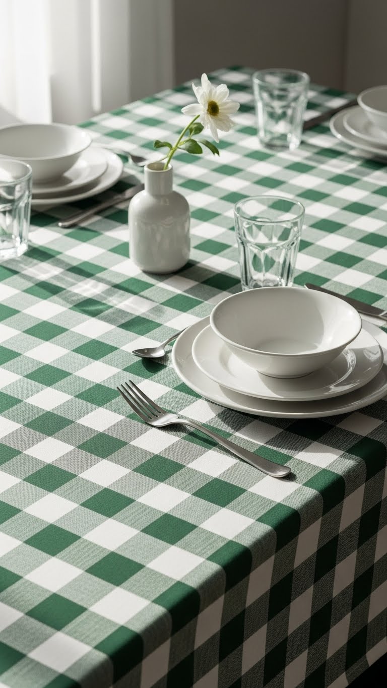Lay out a checkered tablecloth in green. Use one from your linen collection. Set it for meals or vignettes. This bases your decor nicely. Find one at a thrift store for cheap. Do this in seconds. Place on kitchen tables. No ironing needed if it’s smooth. Add dishes on top. Friends will note the theme. Keep it practical.