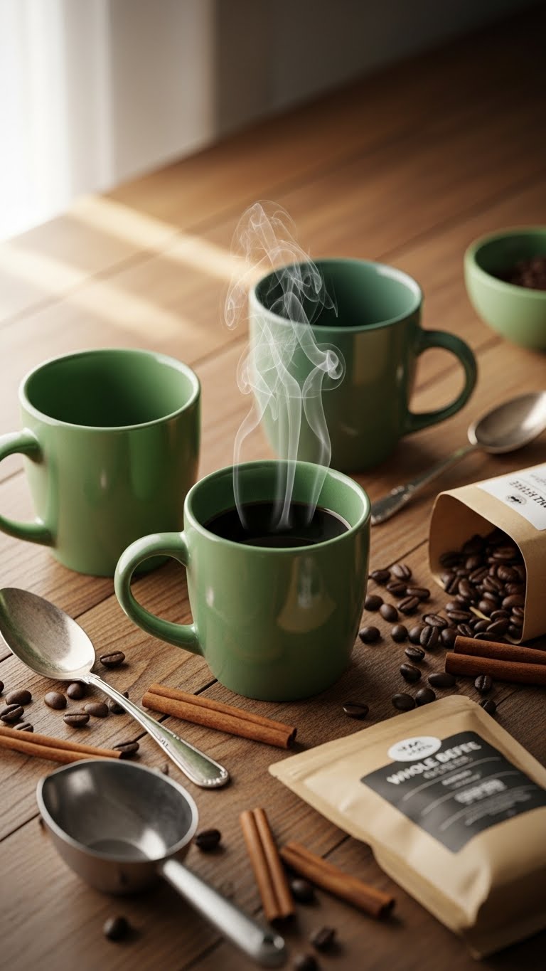 Arrange mugs and coffee on a bar. Add green garlands around it. This makes a fun station. Use items from your kitchen. Coffee is already in stock. Set up in 10 minutes. Place in your living area. No bar tools required. Invite friends for drinks. Try simple brews. Keep it affordable.