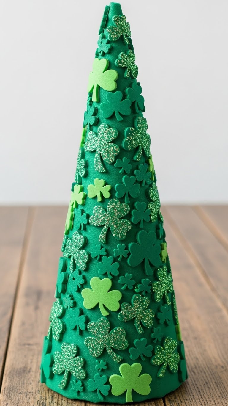 Cover a styrofoam cone with green paper. Add shamrocks all over. Put it on tables as decor. This is quick and glittery. Buy a cone for $2. Use paper you have. Make it in 20 minutes. Place as a centerpiece. No advanced steps needed. Kids can join in. See how it stands out.