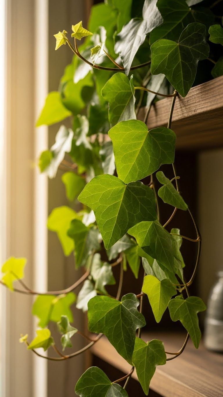 Hang English Ivy on shelves. Let it grow for vertical green. This adds height to spots. Get a plant for low cost. Water it weekly. Set up in minutes. Place in corners. No special care required. Use for luck vibes. Friends will like the look.