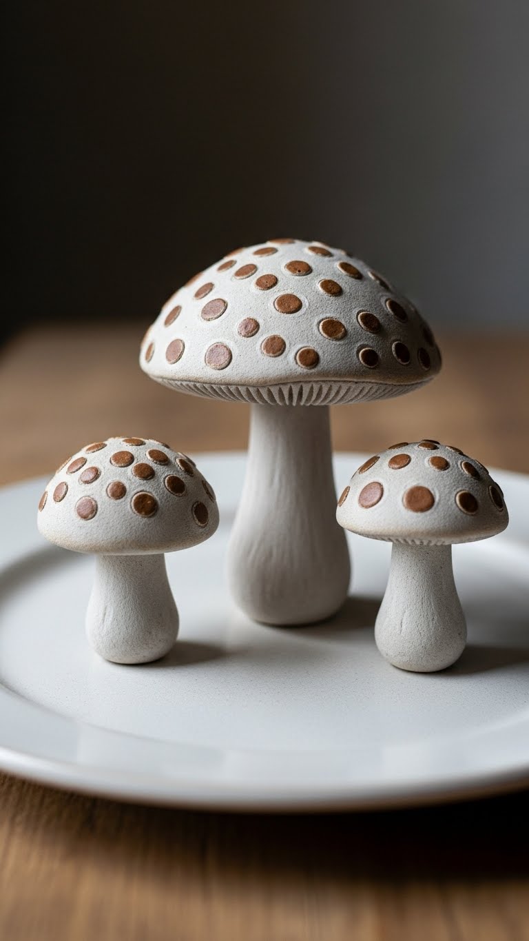 Mold clay into mushrooms with spots. Let them air-dry. Add to your vignettes. This is a sculpted accent. Clay costs little. Do it over a day. Place on tables. No baking needed. Try for unique touches.